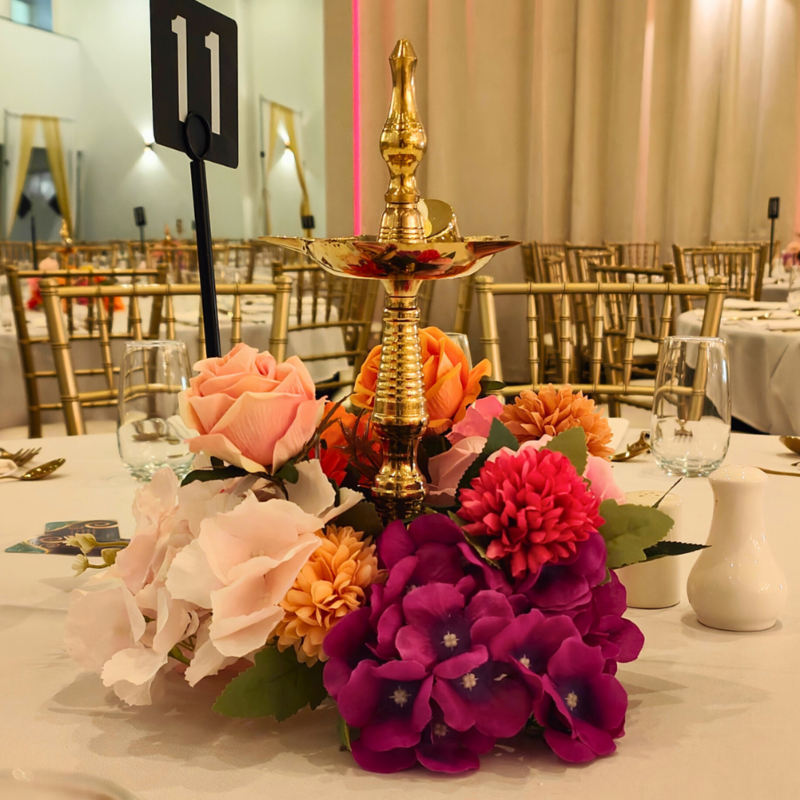 Floral centerpieces, crystal vases, and traditional brass artifacts add elegance.